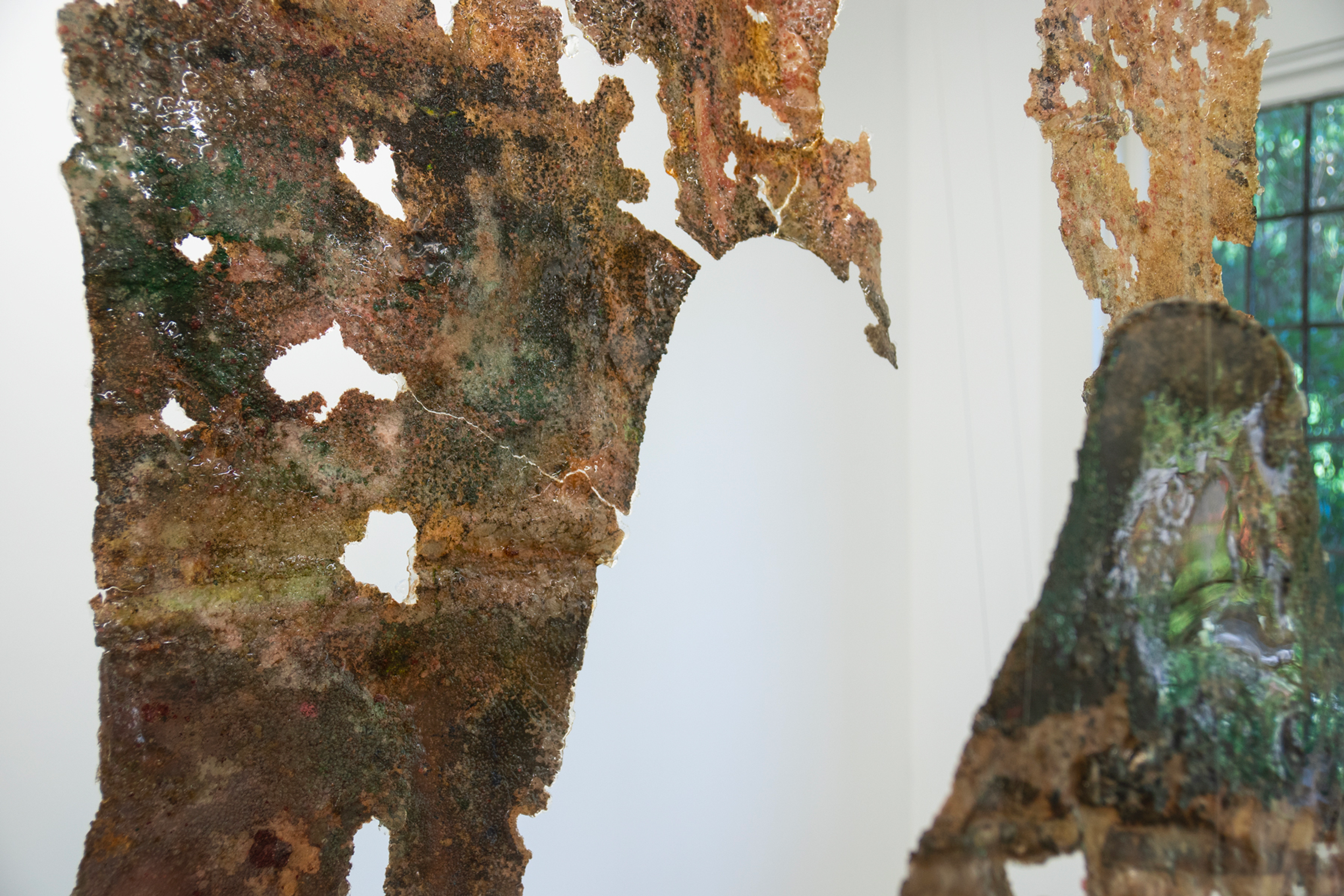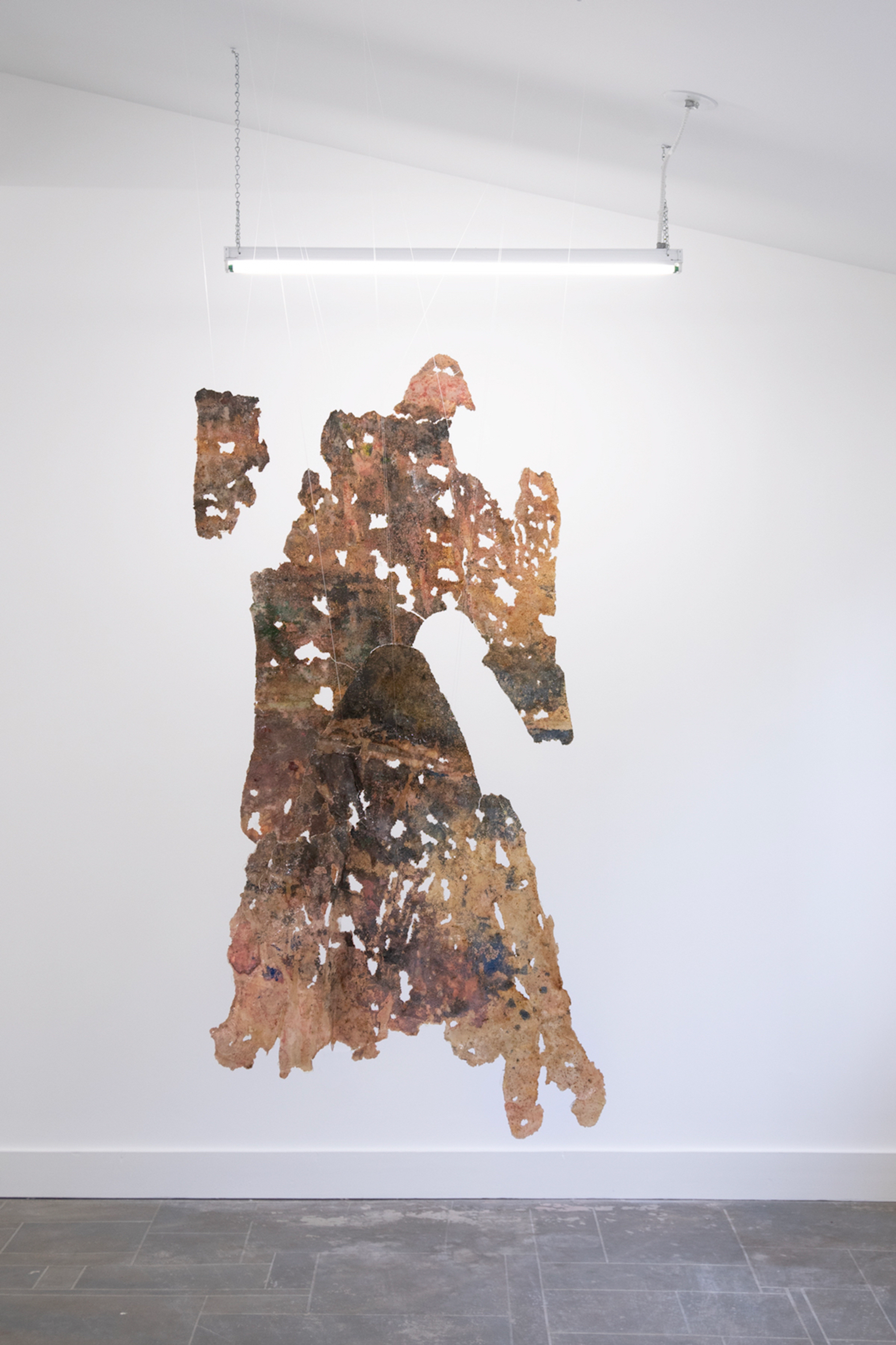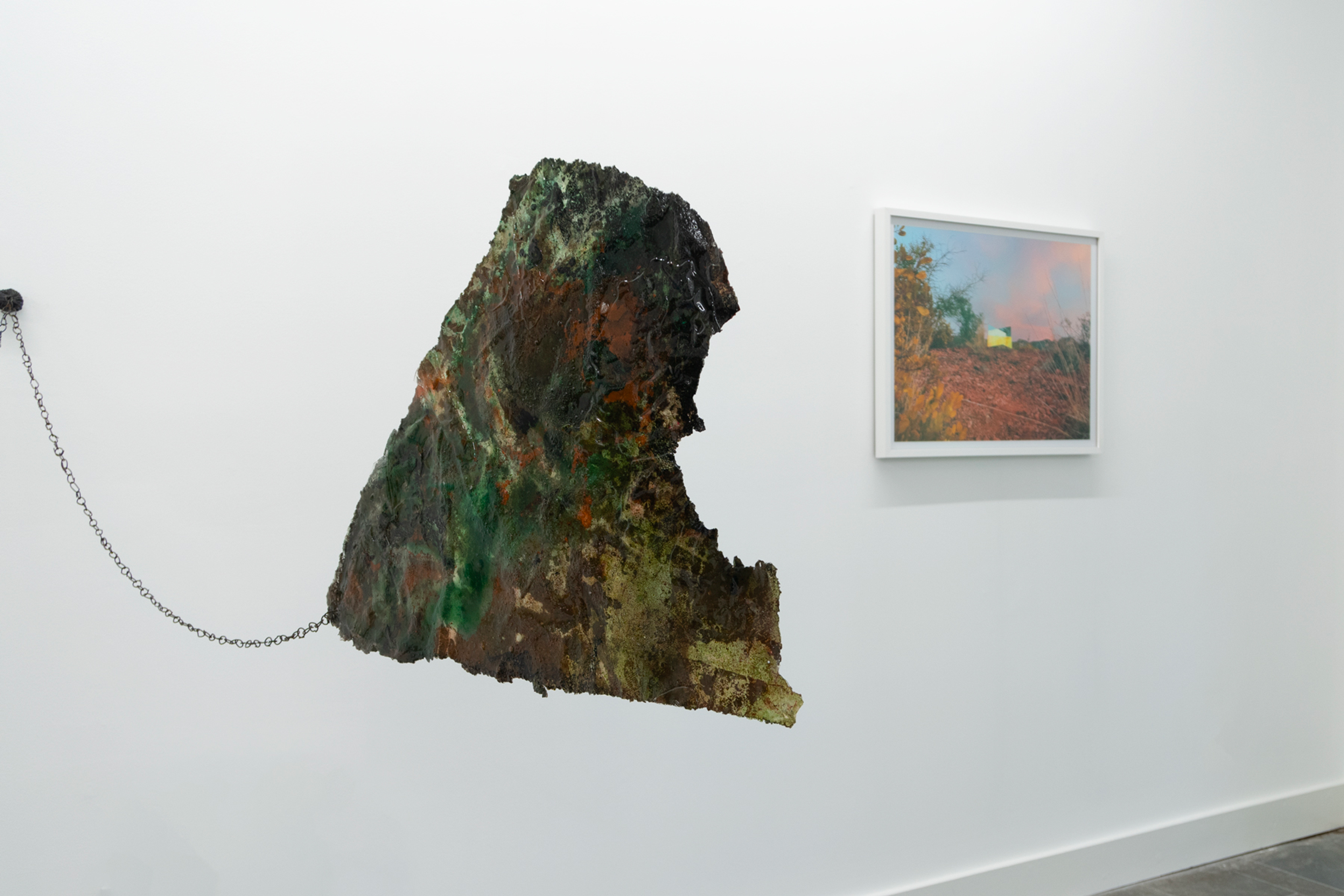 Thill became interested in the phrase “angelic quarry” as it has appeared in Jewish mystical writings, referring to the source of life, endlessly springing from rock. To get closer to the divine, the Kabbalah tradition instructs to “cleave” to it, which means both to split and to join. While an angelic quarry is never-ending, human endeavors come up short, eventually exhausting mineable materials. The quarry becomes a site of quiet conflict, where an experience of nature is openly contaminated by the motives of racial-capitalism that repurpose so much of the world, and people in it, as raw material. To create the works on view, she uses a method of intentional contamination, submerging paper in a bath of natural pigments, metallic powders, salt, and sand, as well as spices, glue, soaps, and other household chemicals and foodstuffs. After the pooled liquids evaporate and crystallize onto the paper, Thill applies a resin coat, creating a kind of earthly dermis. The index of Thill’s body appears in her work Petro-Queen III, a hanging sculpture of crusted salts that renders her open legs and the void in between them as equally solid, equally riddled with holes.