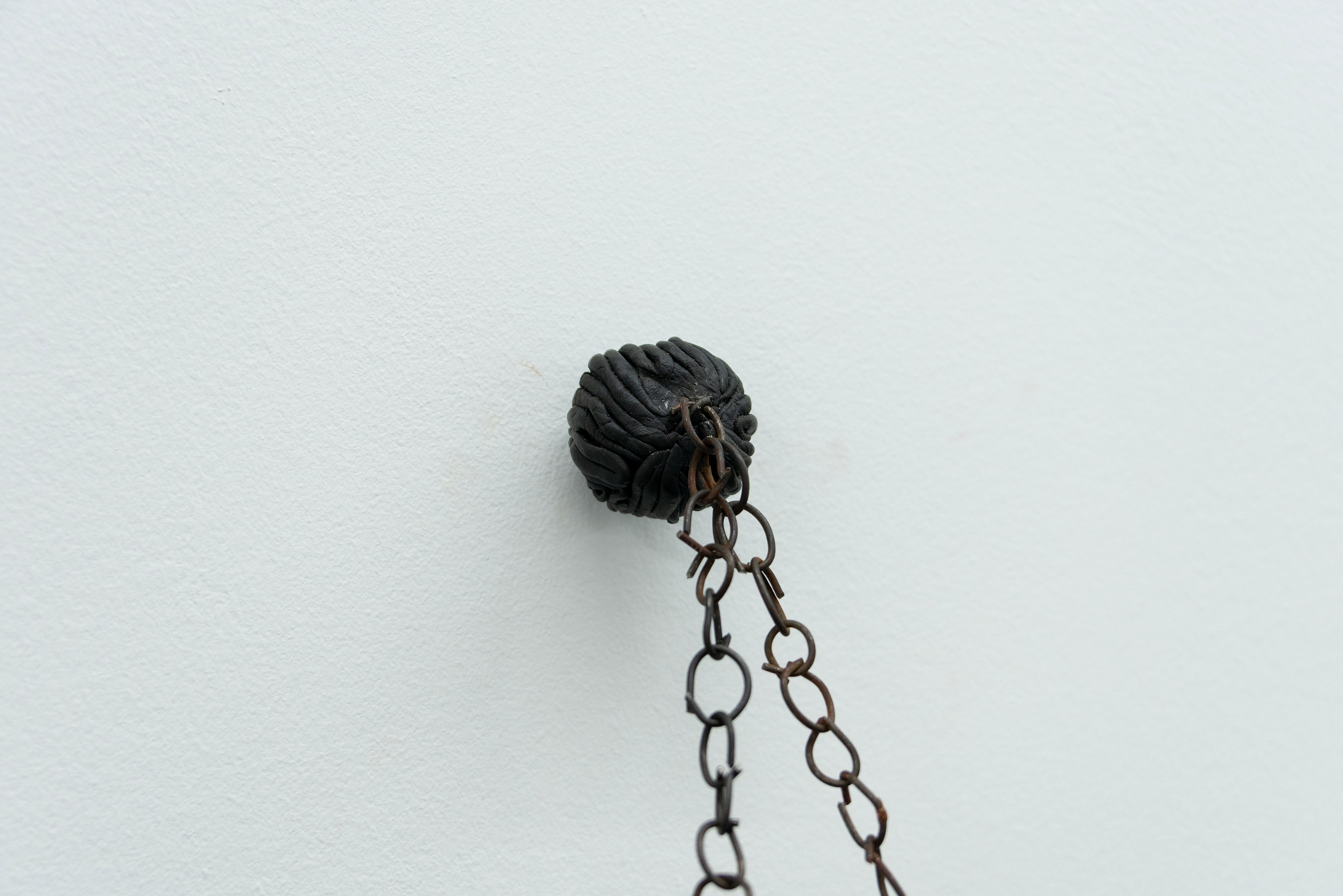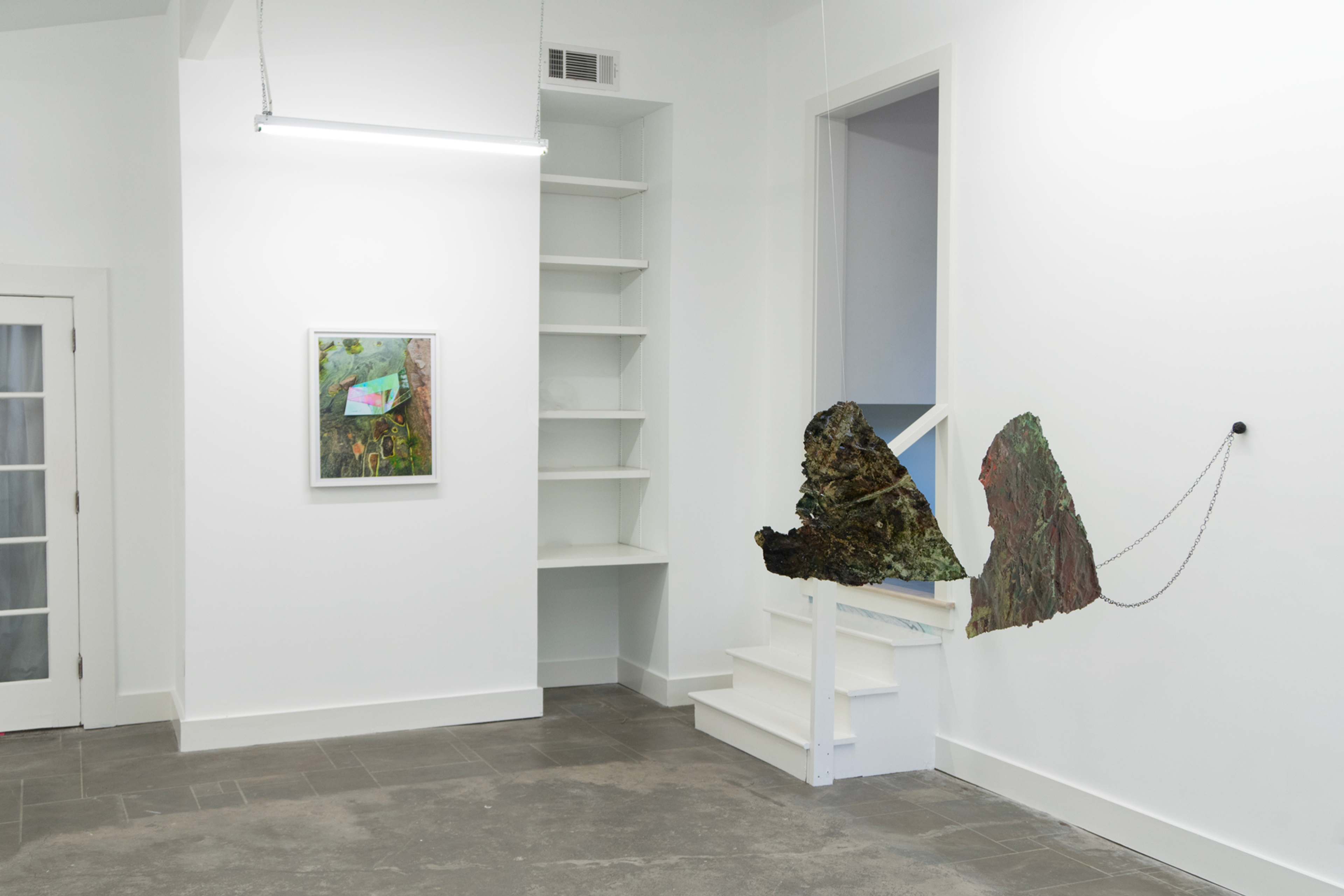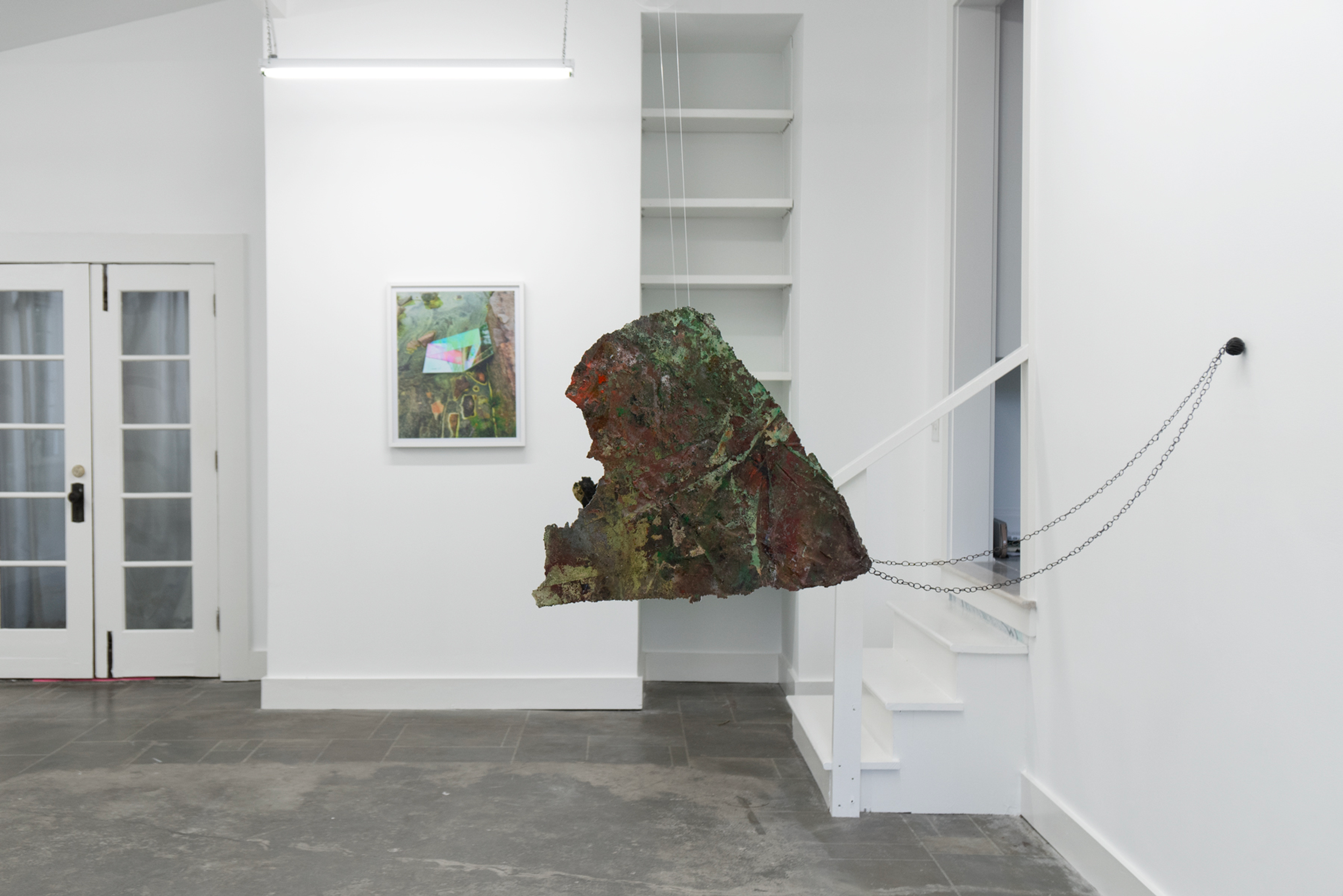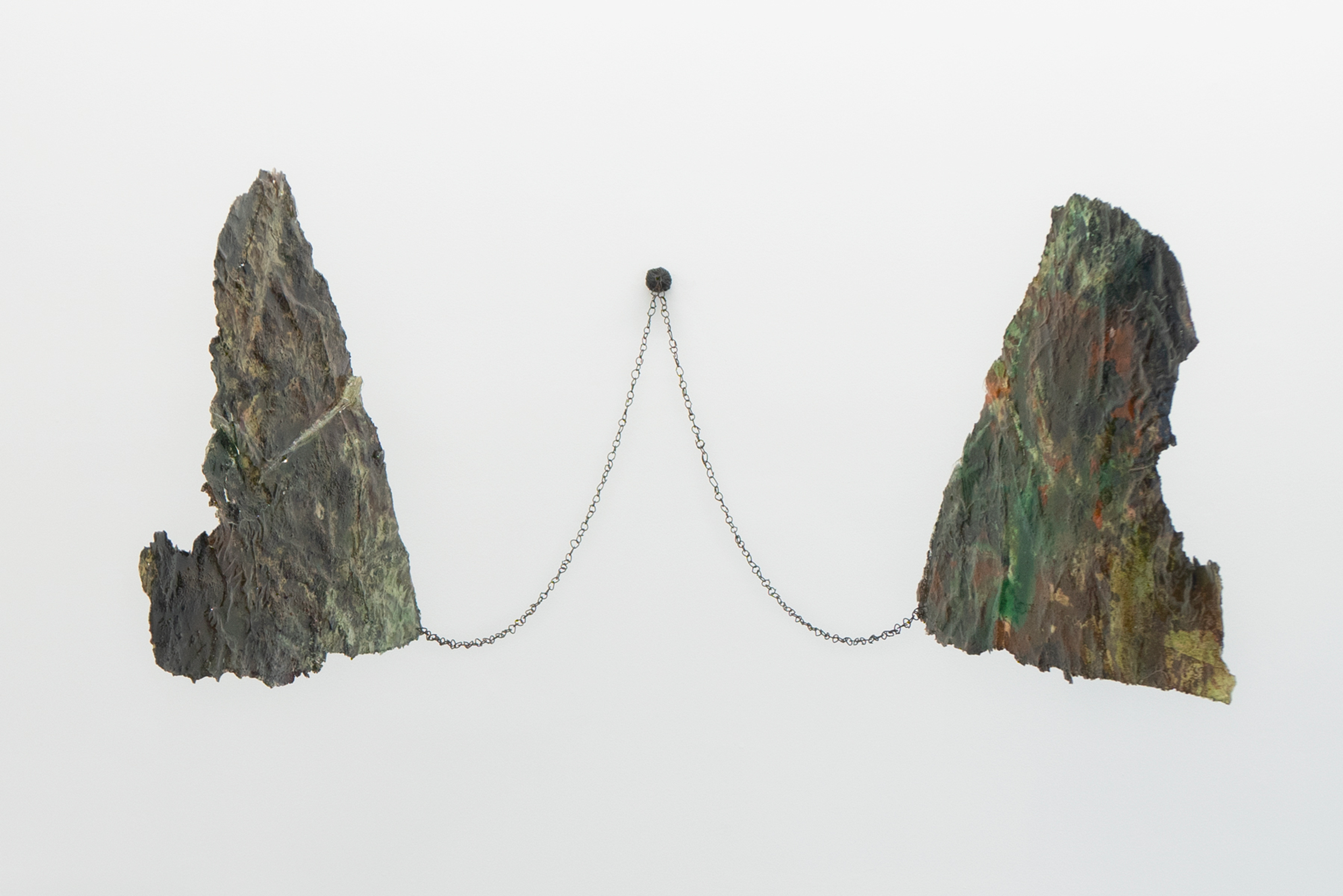 Thill became interested in the phrase “angelic quarry” as it has appeared in Jewish mystical writings, referring to the source of life, endlessly springing from rock. To get closer to the divine, the Kabbalah tradition instructs to “cleave” to it, which means both to split and to join. While an angelic quarry is never-ending, human endeavors come up short, eventually exhausting mineable materials. The quarry becomes a site of quiet conflict, where an experience of nature is openly contaminated by the motives of racial-capitalism that repurpose so much of the world, and people in it, as raw material. To create the works on view, she uses a method of intentional contamination, submerging paper in a bath of natural pigments, metallic powders, salt, and sand, as well as spices, glue, soaps, and other household chemicals and foodstuffs. After the pooled liquids evaporate and crystallize onto the paper, Thill applies a resin coat, creating a kind of earthly dermis. The index of Thill’s body appears in her work Petro-Queen III, a hanging sculpture of crusted salts that renders her open legs and the void in between them as equally solid, equally riddled with holes.