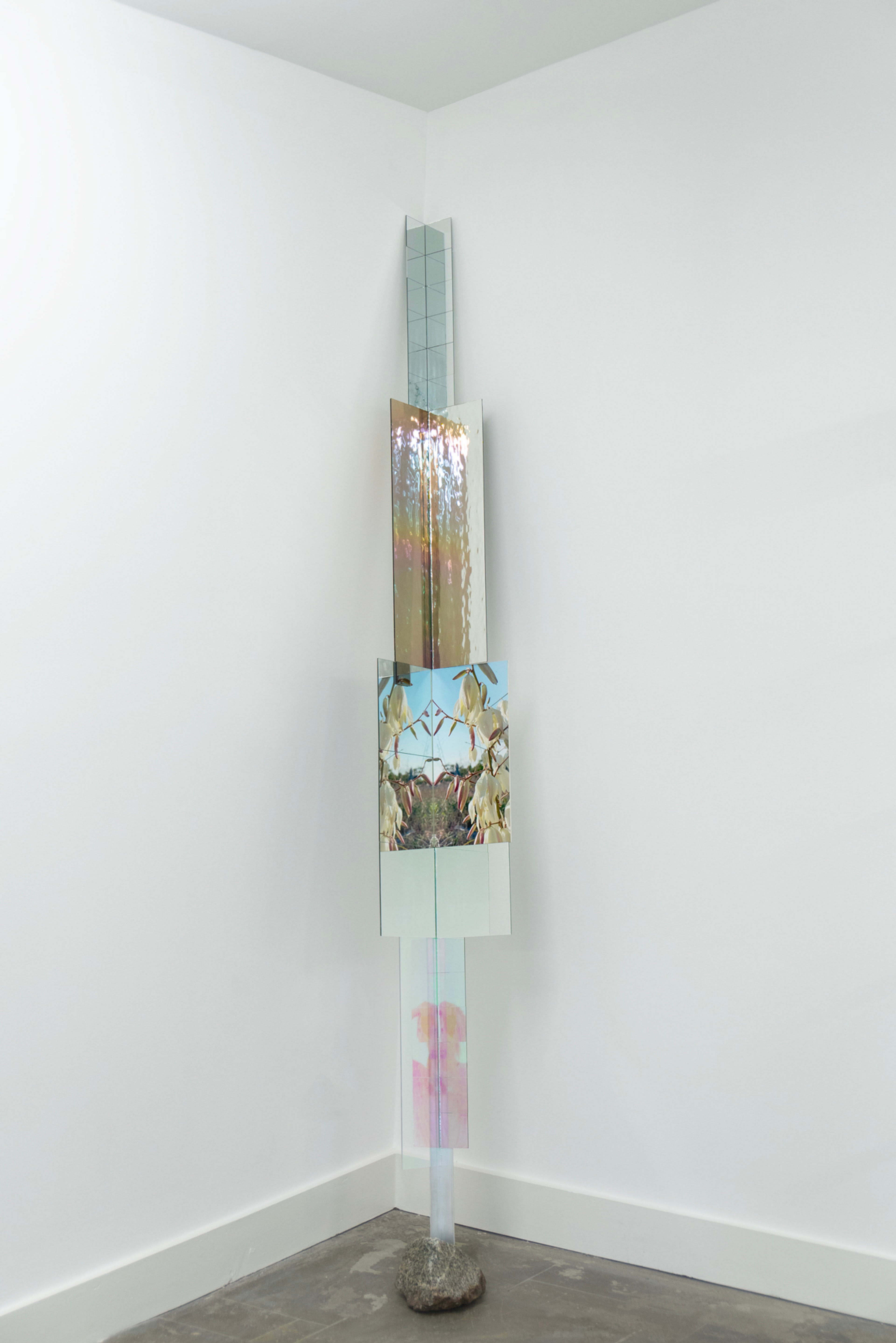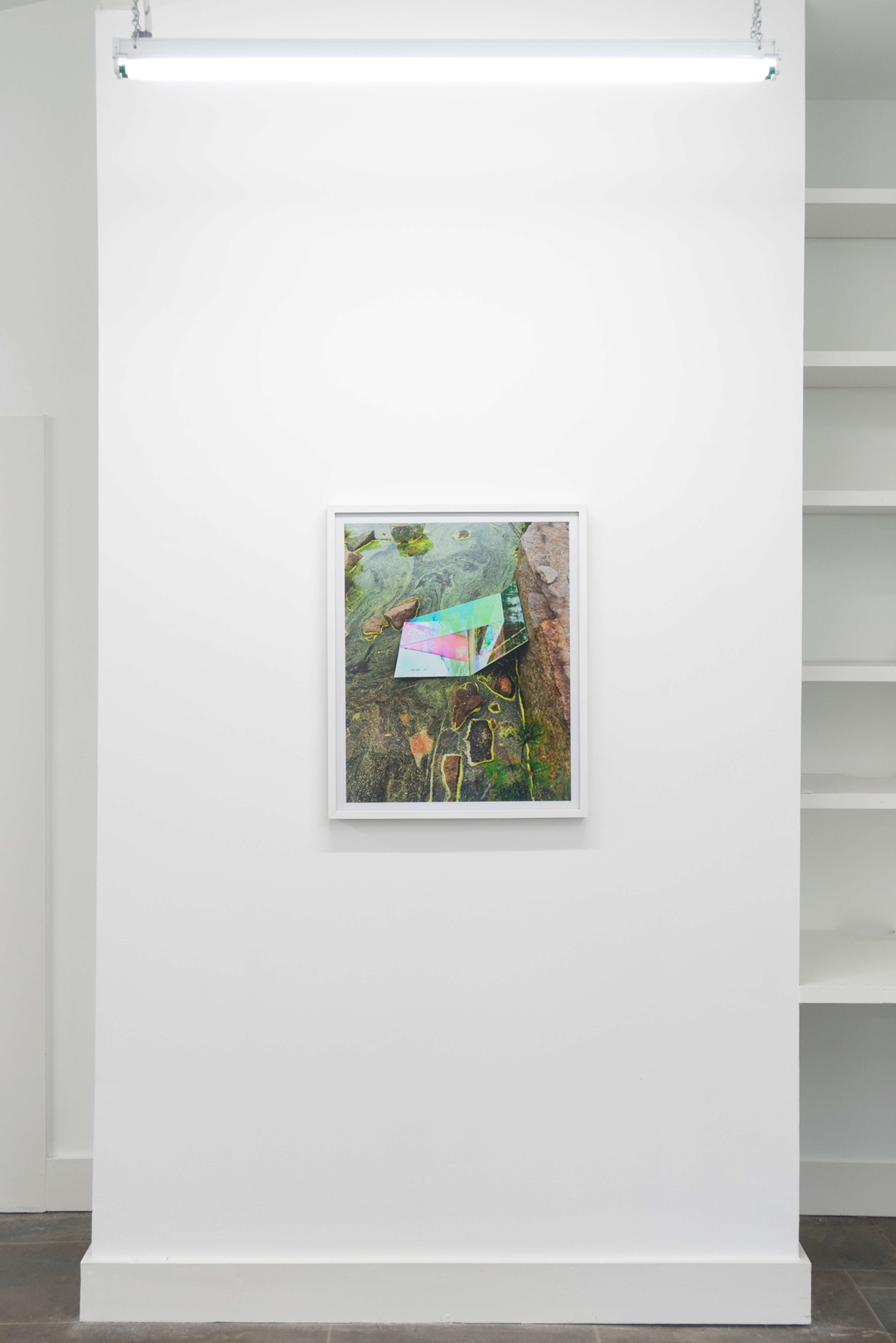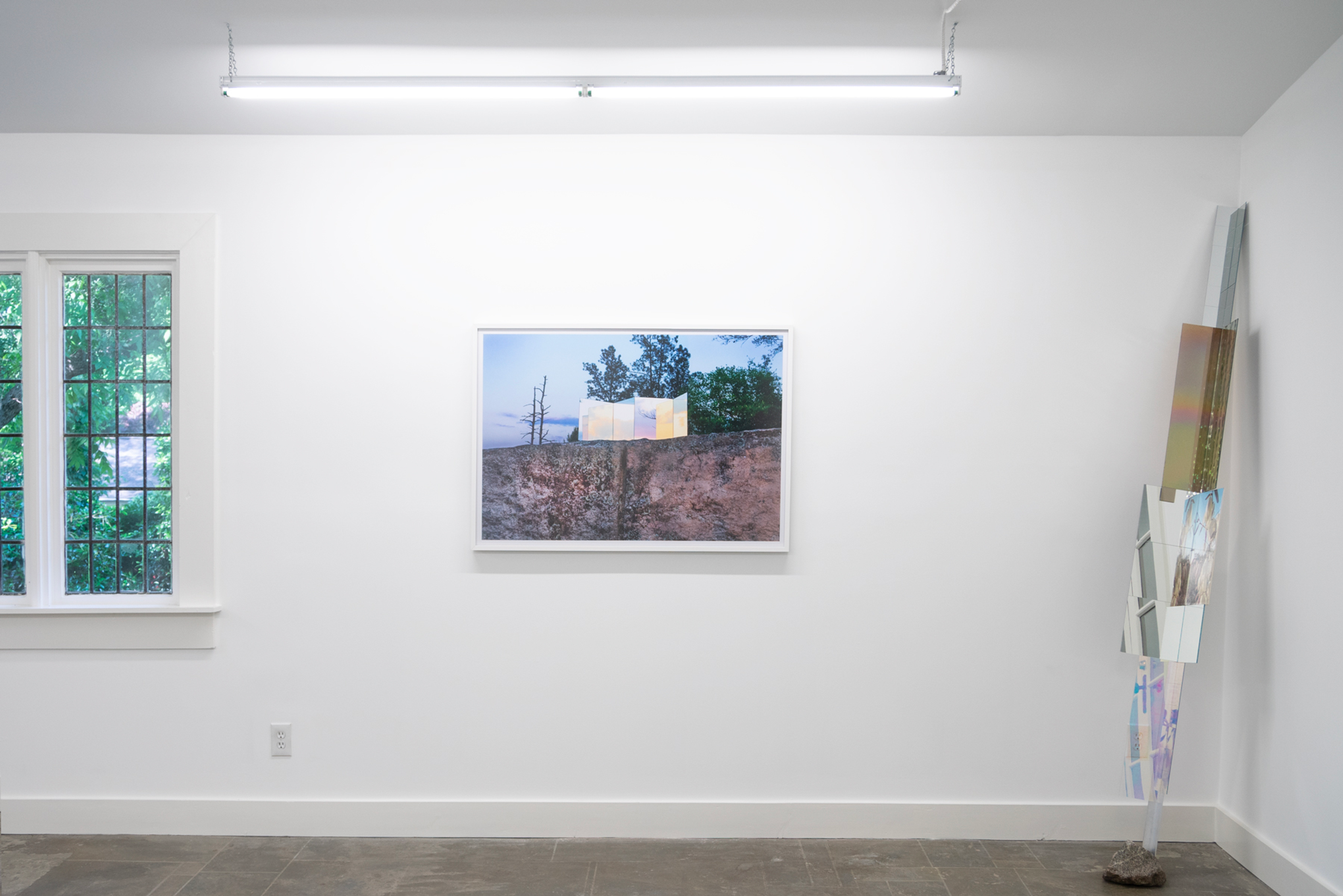 Frey grew up on an abandoned quarry lake. As a girl, she ran through the overgrown rocky terrain not knowing that men had shaped this landscape too. It was only later that she learned its former use, and found a powerful attraction to the compromised yet awe-inspiring landscape. In response to the beauty and inherent destruction belonging to these natural wounds, she adopted devotional practices such as moving and arranging large quantities of rocks into patterns using her own body. In the works on view, Frey pairs human-made materials such as dichroic glass and reflective surfaces with available rubble, combining ingredients that are the detritus of the quarrying industry and millions of years of erosion with manufactured materials in impermanent arrangements. A photograph is all that remains of these transitory marks in spaces defined by the immensity of geologic time. Frey’s method of tapping into the sublime reminds us of our place in relation to the billions of years since the planet began, and consequently the forces greater than us.