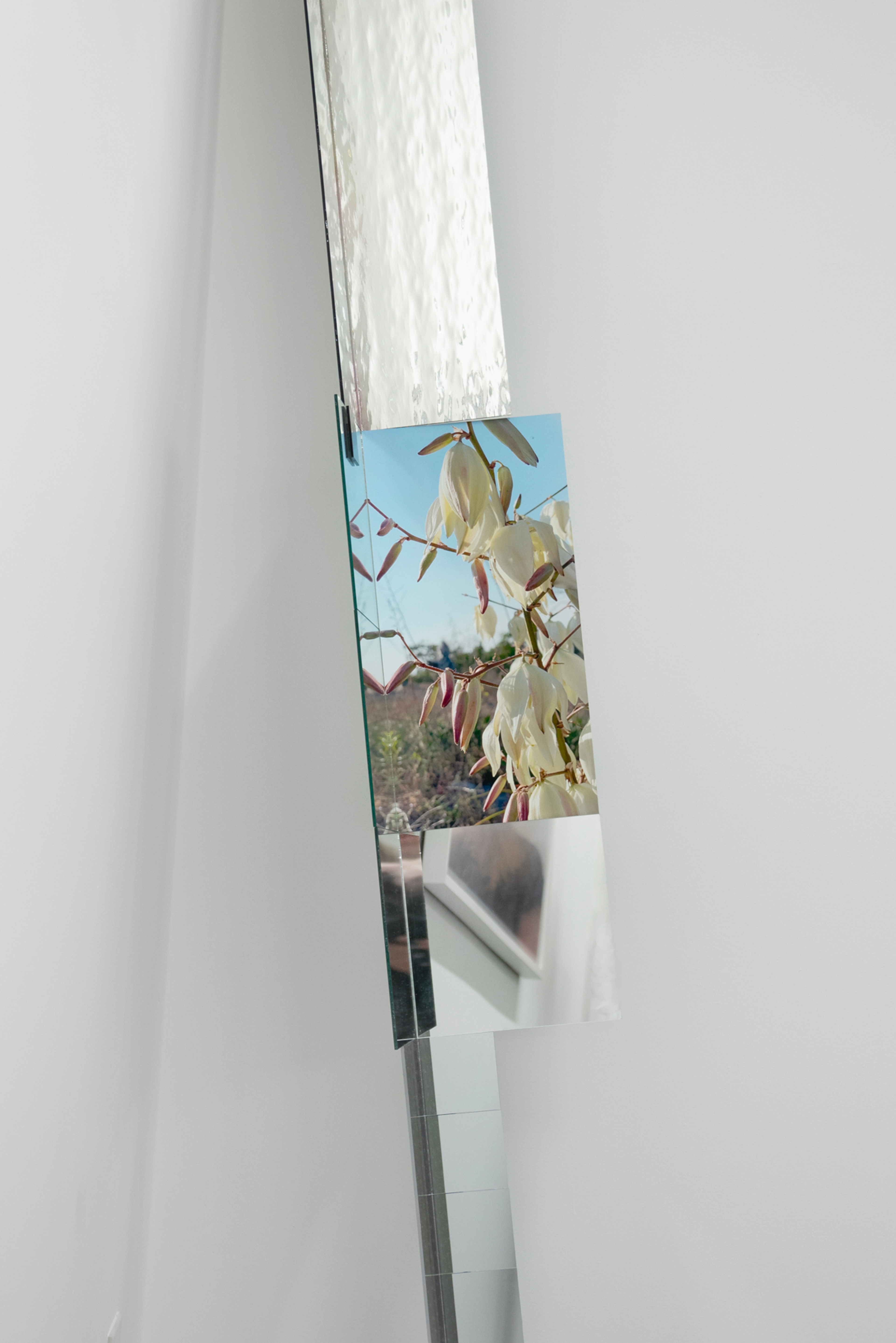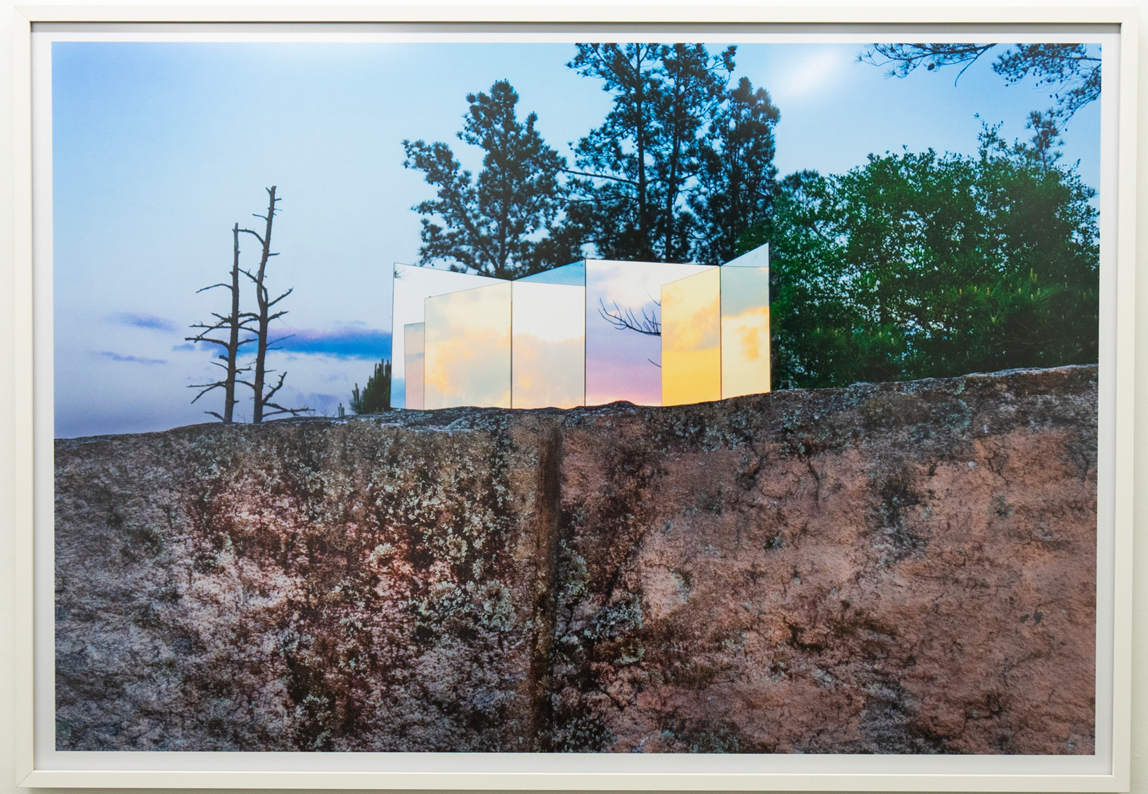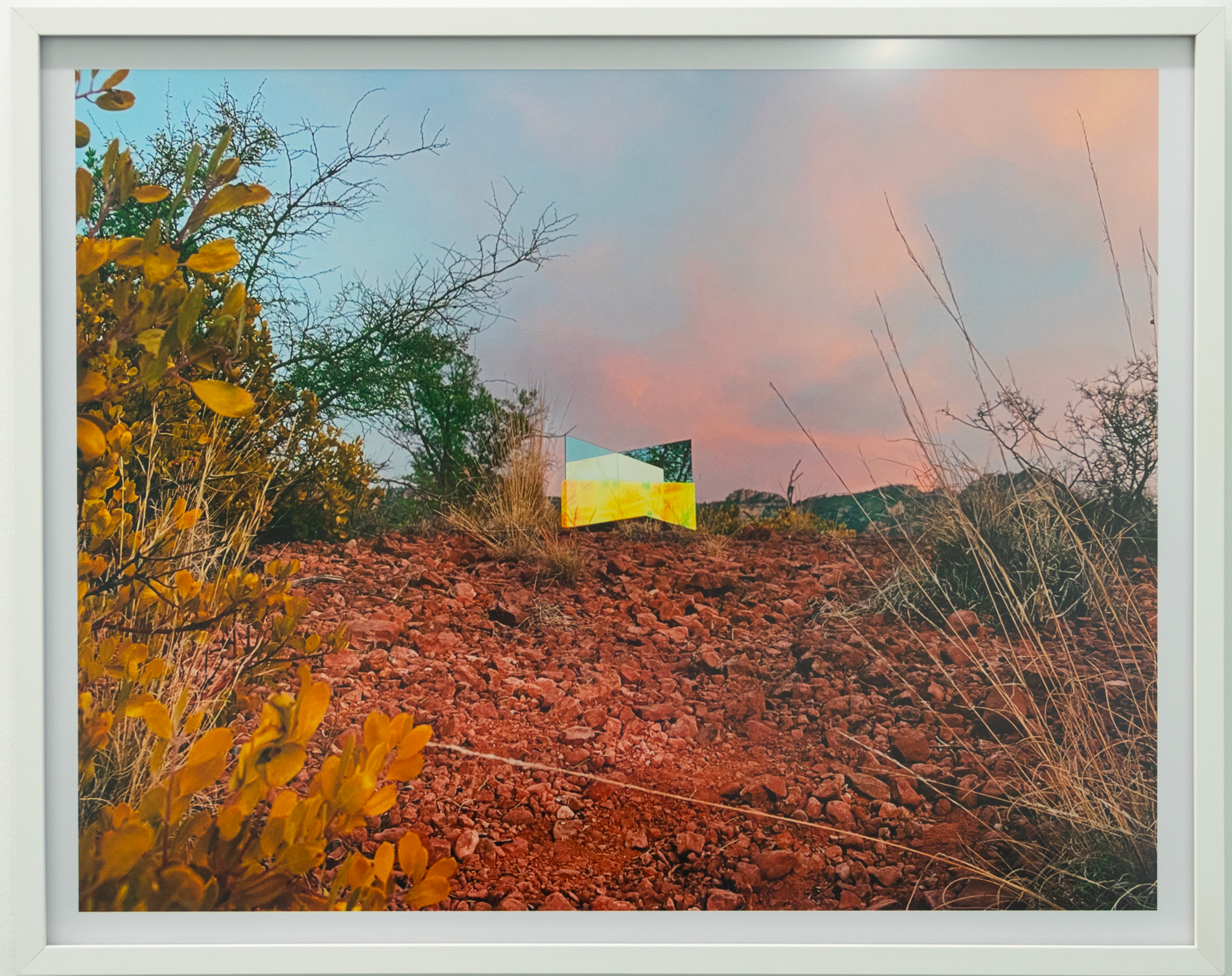 Frey grew up on an abandoned quarry lake. As a girl, she ran through the overgrown rocky terrain not knowing that men had shaped this landscape too. It was only later that she learned its former use, and found a powerful attraction to the compromised yet awe-inspiring landscape. In response to the beauty and inherent destruction belonging to these natural wounds, she adopted devotional practices such as moving and arranging large quantities of rocks into patterns using her own body. In the works on view, Frey pairs human-made materials such as dichroic glass and reflective surfaces with available rubble, combining ingredients that are the detritus of the quarrying industry and millions of years of erosion with manufactured materials in impermanent arrangements. A photograph is all that remains of these transitory marks in spaces defined by the immensity of geologic time. Frey’s method of tapping into the sublime reminds us of our place in relation to the billions of years since the planet began, and consequently the forces greater than us.
